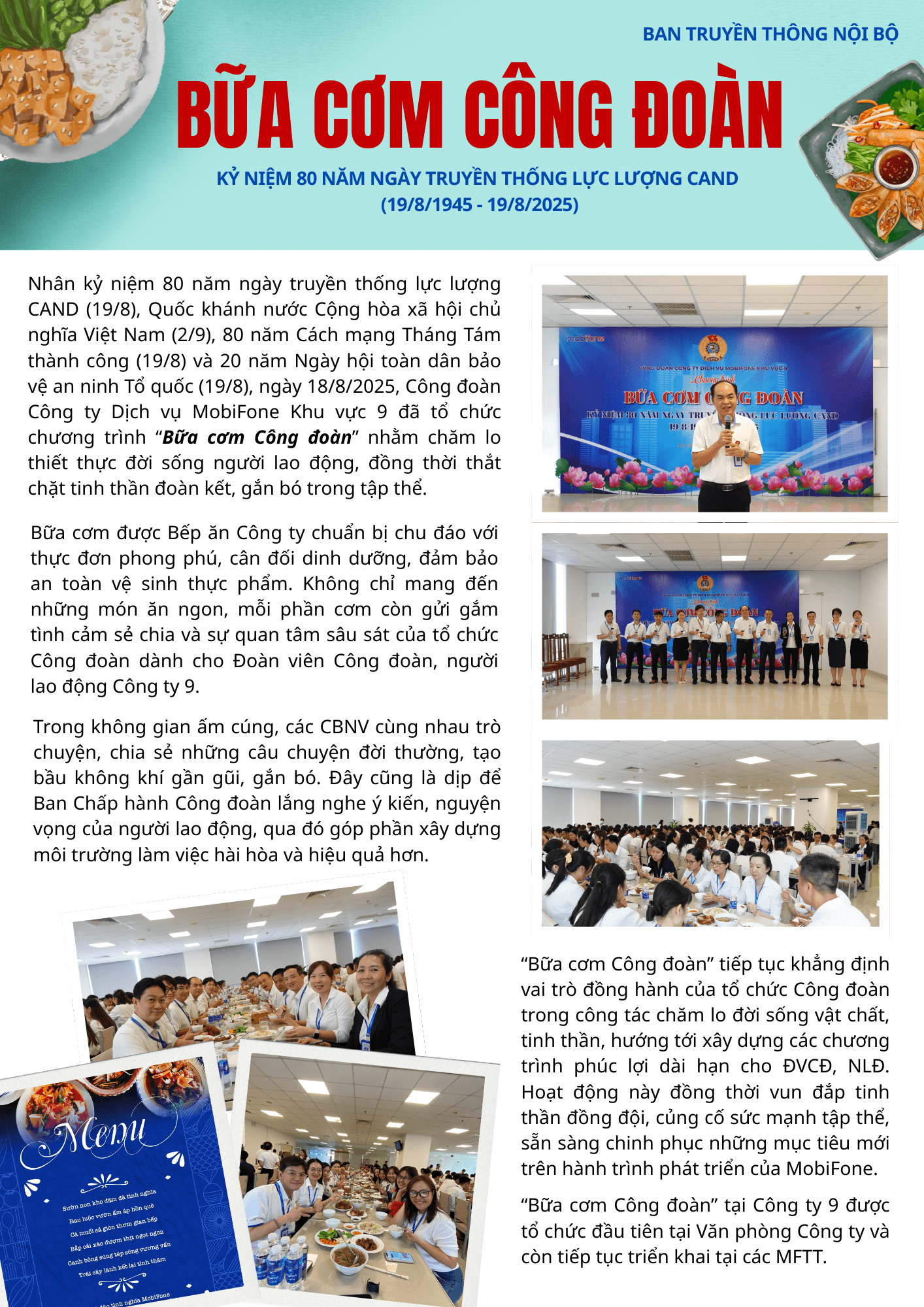 Nhân kỷ niệm 80 năm ngày truyền thống lực lượng CAND (19/8), Quốc khánh nước Cộng hòa xã hội chủ nghĩa Việt Nam (2/9), 80 năm Cách mạng Tháng Tám thành công (19/8) và 20 năm Ngày hội toàn dân bảo vệ an ninh Tổ quốc (19/8), ngày 18/8/2025, Công đoàn Công ty Dịch vụ MobiFone Khu vực 9 đã tổ chức chương trình “Bữa cơm Công đoàn” nhằm chăm lo thiết thực đời sống người lao động, đồng thời thắt chặt tinh thần đoàn kết, gắn bó trong tập thể.