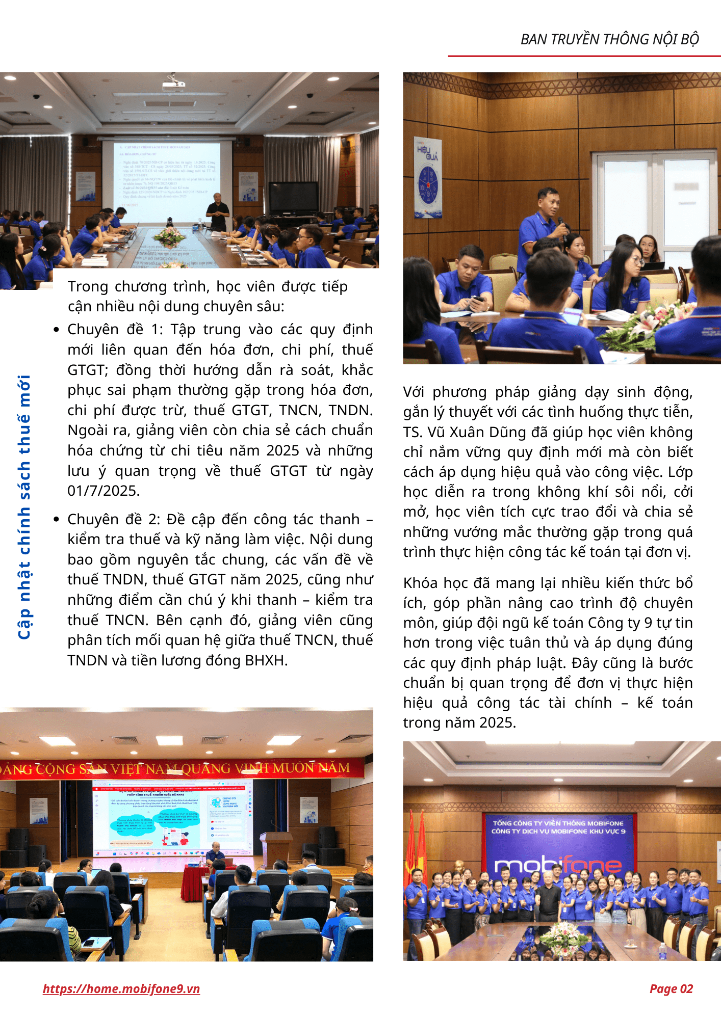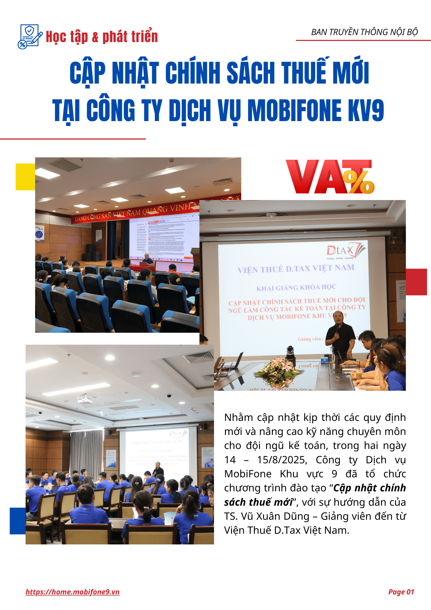 Nhằm cập nhật kịp thời các quy định mới và nâng cao kỹ năng chuyên môn cho đội ngũ kế toán, trong hai ngày 14 – 15/8/2025, Công ty Dịch vụ MobiFone Khu vực 9 đã tổ chức chương trình đào tạo “Cập nhật chính sách thuế mới”, với sự hướng dẫn của TS. Vũ Xuân Dũng – Giảng viên đến từ Viện Thuế D.Tax Việt Nam.